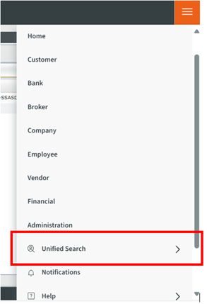 If the screen size is reduced, the Hamburger icon (three horizontal lines) will replace the top navigation bar. You can locate Unified Search in the drop-down menu.