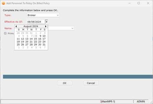 To add a broker mid-term, open a billed policy and select "New" in either the Personnel grid or the View Commission grid. When the “Add Personnel To Policy On Billed Policy” opens, the “Effective As Of” date will default to the policy's effective date. To select an available date, click on the drop-down menu to open up the calendar for date selection, or else type the date directly into the box.