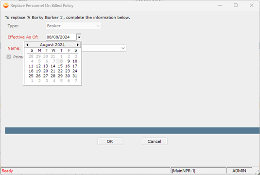 To replace a broker mid-term, open a billed policy and select the replacement link in the Policy Personnel grid. When the “Replace Personnel On Billed Policy” form opens, the “Effective As Of” date will default to the policy's effective date. To select an available date, click on the drop-down menu to open up the calendar for date selection, or else type the date directly into the box.