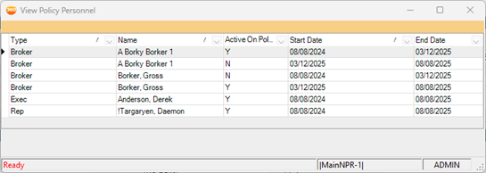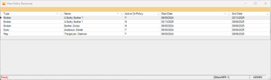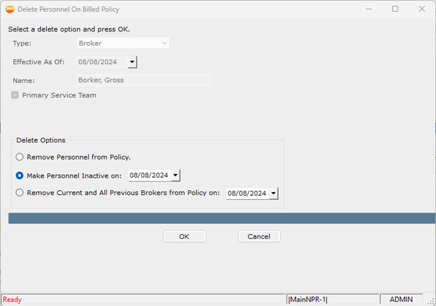 On some future date, I realize that a different broker should have been active on the policy from 02/13/2025 until the policy expiration date. When deleting Gross Broker, I choose to remove current and all previous brokers on the policy as of 02/13/2025, so I can add the new broker to the policy on the correct date. Before adding the new broker, my policy personnel periods changed to reflect the Gross Broker being completely removed, as well as “A Borky Broker 1” having an adjusted inactive date of 02/13/2025.