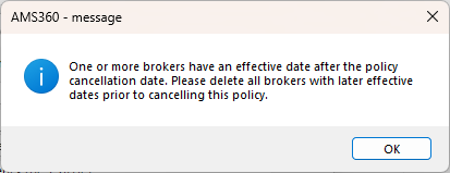 When cancelling a policy mid-term and choosing to set the expiration date the same as the cancellation date, if a broker’s term takes place entirely after that date, then the system will ask for the broker's removal before the cancellation can take effect. This is to ensure that invoicing reflects the correct commissioned personnel.