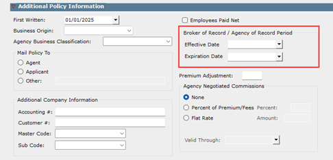 In the Additional Policy Information section within a policy, there are two dates for the broker or agency of record period, the Effective Date and the Expiration Date.
