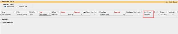Broker or Agency of Record dates can apply to both agency-billed and direct-billed policies. If these dates are on direct-billed policies that are billed through direct-bill entry statements, a BOR Eff Date column has been added to show the presence of BOR/AOR dates.