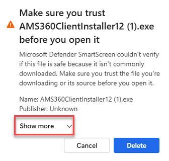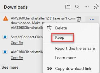 Based on their security setup, some workstations may be required to select "Keep" in the below workflow to ensure that AMS360 is installed properly. Follow these steps: