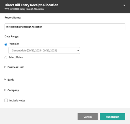 The pre-filted selections for this report include: Date Range, Business Unit, Bank, and Company, plus an option to include notes entered in either the receipt or direct bill entry statement in the report results.*