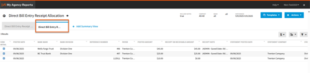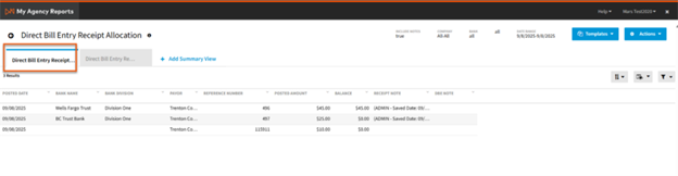The first view in the report is Direct Bill Entry Receipt Allocation.