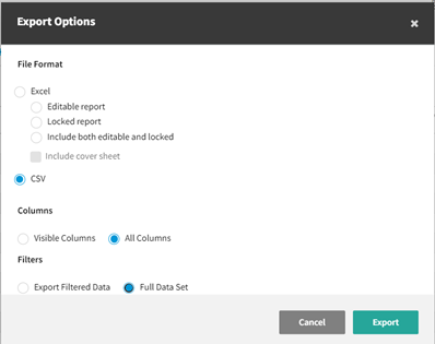 Select the Filters as "Filtered Data" or "All Data," where filtered data means you can use the report filters to limit the rows for export