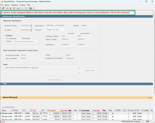 A new system has been implemented so that users will not be affected by timeouts or other errors. Direct Bill Entry statements now process each invoice individually instead of in a single transaction. In addition, the process provides a retry button for individual invoices that were not processed, changes the statement status to "Voided" once all invoices have been voided, and implements a message that reminds users to not run reporting during an ongoing voiding process.