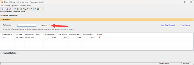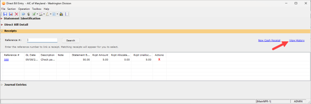 Once the receipt is posted, it will appear as linked in the receipt section of the direct bill entry statement. If you do not see your receipt, confirm that all conditions have been met as outlined in the Criteria for Linking a Receipt section of this article.