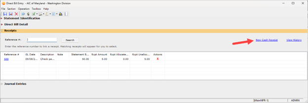 In the receipt section of the statement, there is a link titled “New Cash Receipt,” which allows you to create a new receipt within the statement. This new receipt is limited to posting to the direct-bill commission receivable account and other GL accounts.