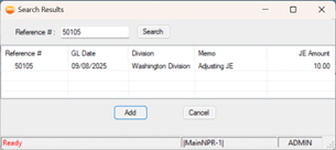 To link the journal entry, enter the exact reference number into the search box. Click the "Search" button, or you may simply hit "Enter" on your keyboard. If the journal entry matches the criteria of the statement (be sure to review the error message section of this article for additional details), the journal entry will appear in a new view to select and add to the statement.