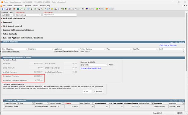 Policy Transactions: Adding New "Annualized Premium" and "Annualized Estimated Revenue" Fields per Line of Business