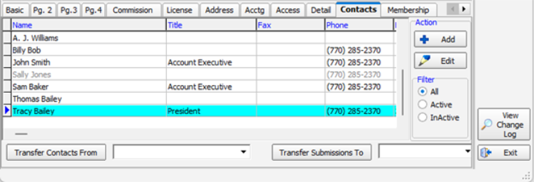 The contacts for the retail agent/broker are displayed on the Contacts tab in the grid layout. We will discuss how to add a new contact. You can use this information later to edit existing contacts. The following table explains the functions of the buttons located on the Contacts tab.