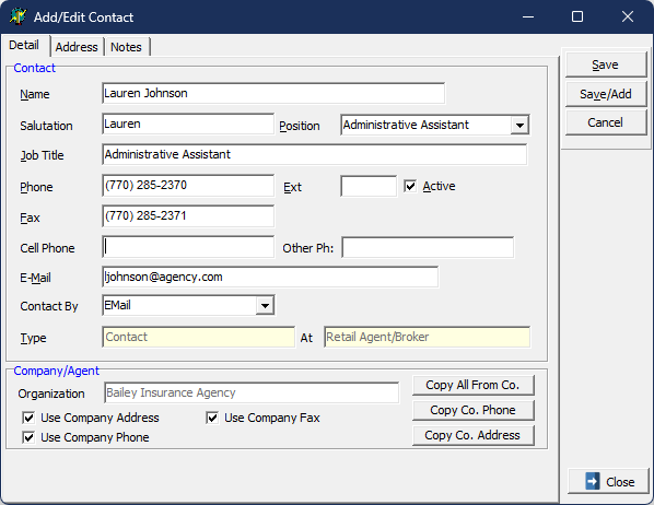 Use this tab to enter and maintain retail agent/broker contacts in the AIM Phone Book. You can also transfer contacts from other companies and transfer submission records to another contact within the same retail agency/broker.