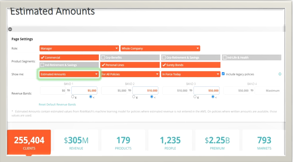 To display the estimates in RiskMatch, from the Show me segment of Page Settings: use the dropdown and click Estimated Amounts. Once Estimated Amounts is the chosen view, all insights being displayed will be based off the predicted model.