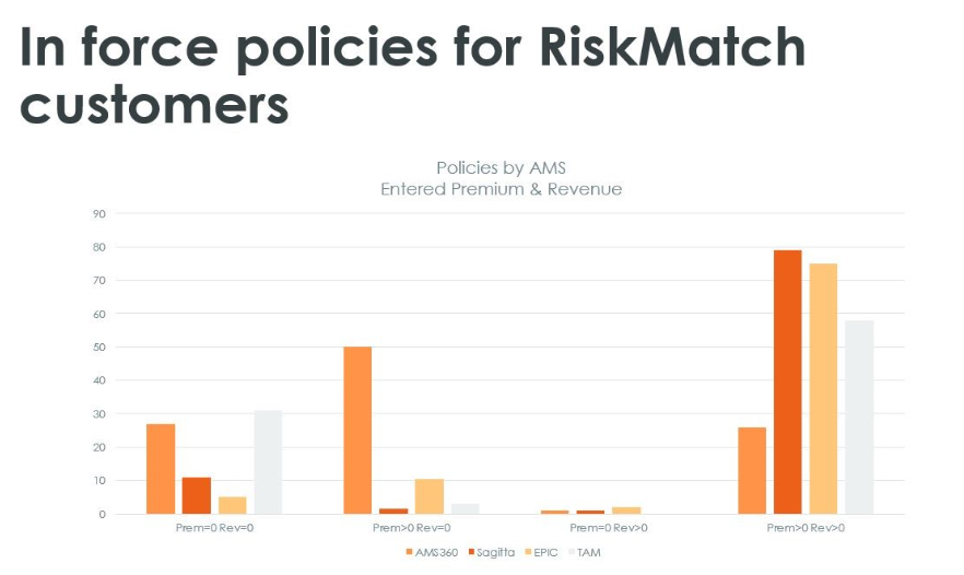 To best illustrate this issue, the RiskMatch team has reviewed in-force policies across different AMS systems at the policy level to determine levels of Premium versus Revenue entered in the system(s). Optimally, when Premium and Revenue is entered (far right graph group), leadership is provided with best insights.