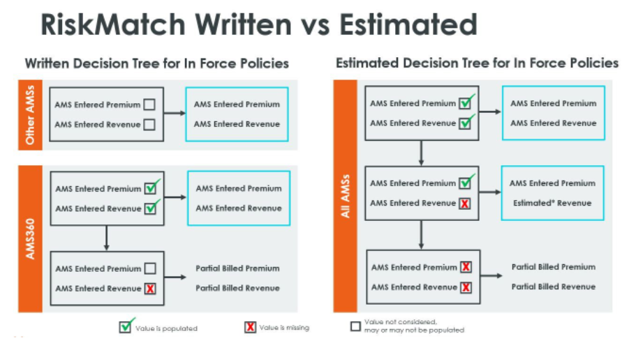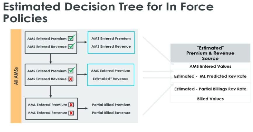 The RiskMatch team reviewed the current Written decision tree (see left table below) based on the AMS data depicting 50 percent of AMS360 policies with missing revenue, and created a Partial Billed backup based on policy billings that may, or may not be complete. While this may be the case, this data set will provide a better estimation than a zero-dollar value.