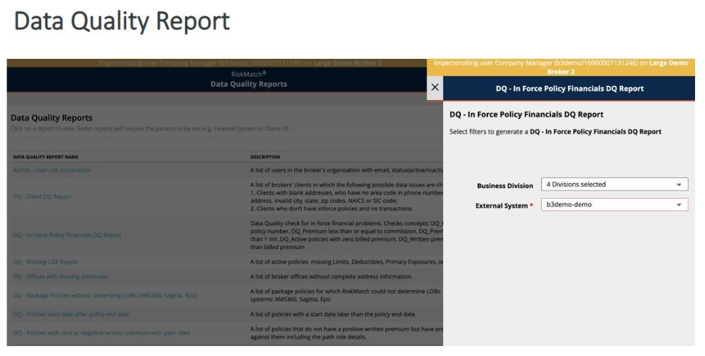 RiskMatch has built a specific Data Quality Report to help with both Written and Estimated amounts. From the RiskMatcn Feature Menu, choose Analytics and Data Quality Report to access the In Force Policy Financials DQ Report.