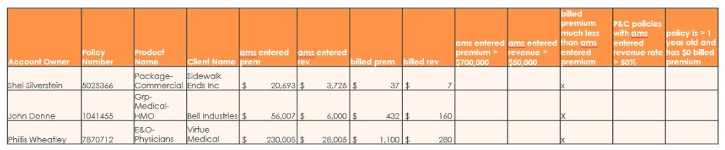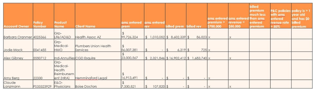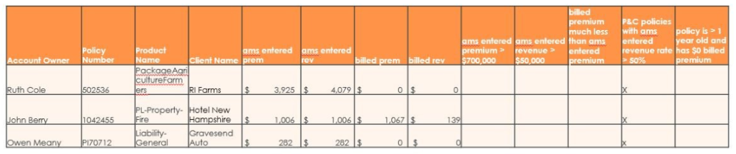 Policy flagged when the AMS-entered premium or revenue is in the top 0.1percent, when entered premium > $700,000 or entered revenue > $50,000