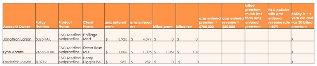 This alteration has greatly improved the Estimated Revenue results. We know this because we can test our Estimated predictions several months later, when the billing cycle completes. Bond and benefits segments will now have a greater emphasis on “Predicted via Partial Billing Rev Rate,” which requires an AMS-entered premium and at least one partial billing. This step multiplies the AMS enter premium by the revenue rate of the first billing. We have found that the first billing is a highly accurate representation of how the policy will look. If there is no AMS-entered premium, we use the actual billed values as a fallback for estimated revenue and premium. In this fallback case, we would have no AMS-entered premium by which to multiply the partial billing revenue rate.