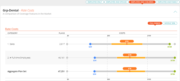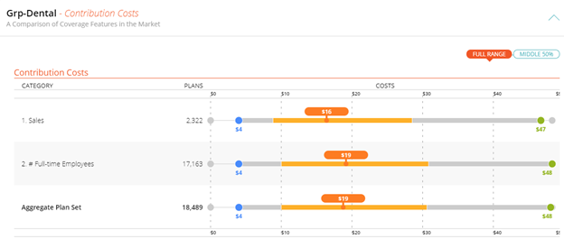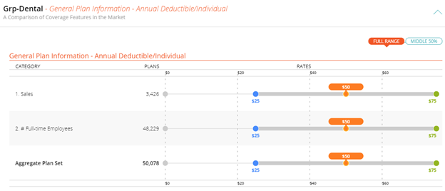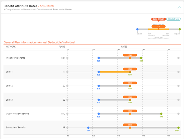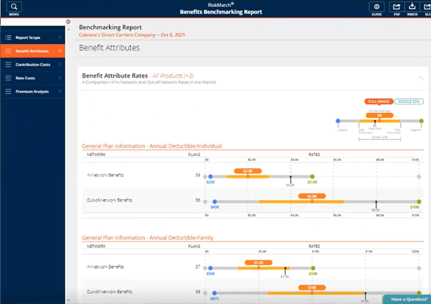 The Benefit Attributes page breaks down how your client’s plan compares against the similar plans from the RiskMatch universe using the median, low, and high values for various plan attributes. A black indicator points to the plan of comparison.