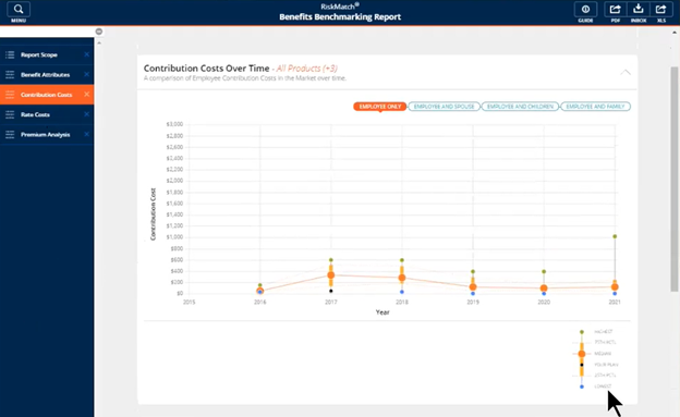 The Contribution Costs page uses a line graph to compare your plan’s contribution costs over time to those of the incumbent plans you are benchmarking against. A black indicator points to the plan of comparison.