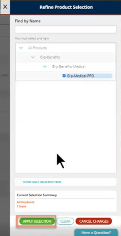 The Refine Product Selection window will pop up on the right side of the screen. Select the product you wish to benchmark and click Apply Selection.