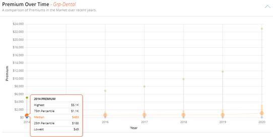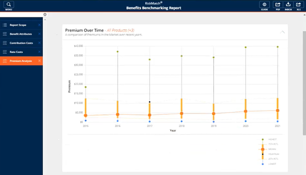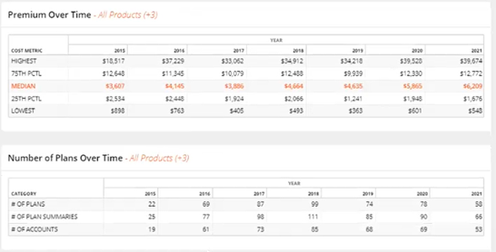 The Premium Analysis page uses a line graph to compare your plan’s premium over time to those of the incumbent plans you are benchmarking against. A black indicator points to the plan of comparison. It also contains tables with more detailed information on the premium over time and number of plans over time.