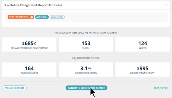Refine your filters under the Refine Categories & Report Attributes section to perfect your dataset and select Generate Benchmark Report. If there are fewer than five plans you may need to remove filters in step 5 or 3.
