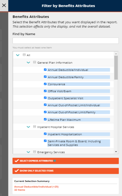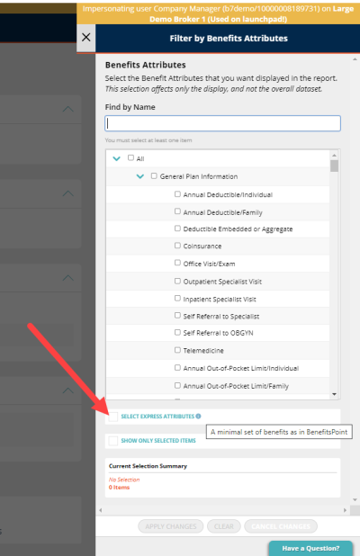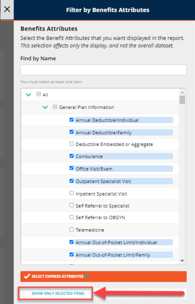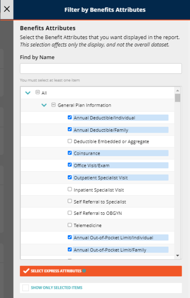 Select, from the pop-up, the attributes you would like to show up on the report. There are multiple ways to do this. You can either click each desired attribute, or you can click Select Express Attributes to auto-select attributes based on the plan type.