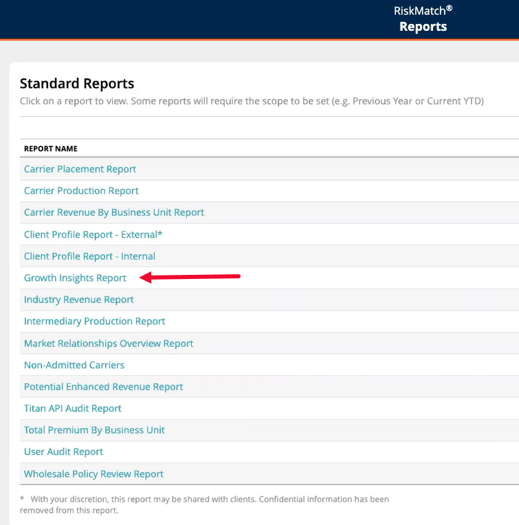 The Growth Insights Report can be accessed in the Standard Reports area of RiskMatch. Standard Reports choices appear above the Inbox within RiskMatch