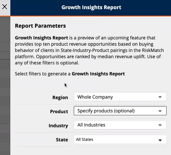 A description of the Growth Insights report is contained within the report parameters selection panel. You may choose to keep the report parameters unchanged and not specified; this allows the machine-learning model to choose the top ten revenue opportunities for clients with whom you have access. Alternatively, you can use drop-down menus to specify Region, Product, Industry and/or State.