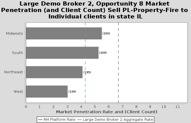 Each horizontal bar chart shows market penetration, there the vertical lines indicate market penetration of your agency (blue line) and the RiskMatch platform rate. The gap between the blue vertical dotted line and the black vertical line is the measure to close with product sales. This is the Growth Insight of under- and over-performance.