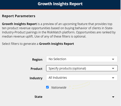 The Nationwide check-box, located above the "State" drop-down selection, allows for the analysis of growth insights on an aggregated national level. In other words, all states where you are doing business will be analyzed for the growth insights Top Ten recommendations.