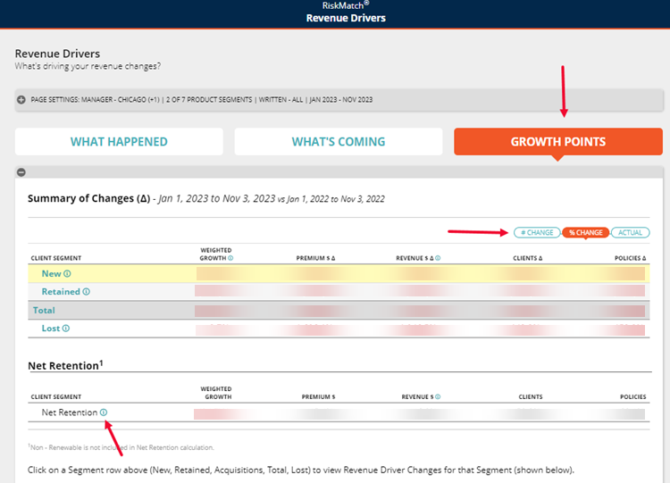 Growth Points provides a quick snapshot of your business by summarizing new, retained and acquired business. Growth Points shows a comparison from a specific time period as compared to a year earlier. Tabs show the information in terms of actual dollars or percentages.