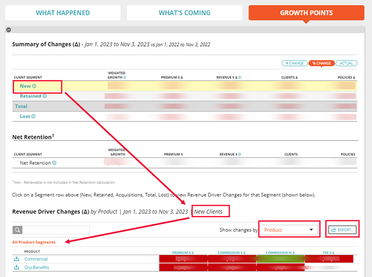 By clicking on Client Segment in the main table, thereby showing new, retained and acquisitions, the table will show Revenue Drivers Changes. This information may be sorted by industry, product, client, business unit, intermediary, or market. Reports may be exported.