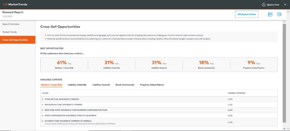 The Cross-Sell Opportunities tab allows you to see what similar insureds are buying. Identify coverage gaps and cross-sell opportunities by analyzing like customers, helping you improve retention and increase revenue. We show the top 5 most frequently purchased products and corresponding % who buy for your chosen industry/product combination.