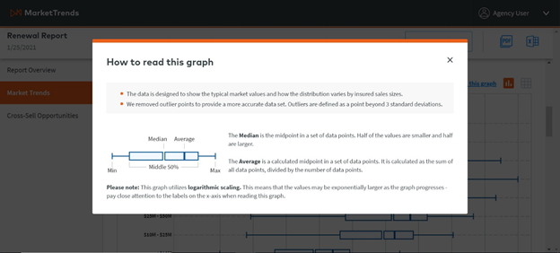 The data is designed to show the typical market values and how the distribution varies by insured sales sizes. We removed outlier points to provide a more accurate data set. Outliers are defined as a datapoints beyond 3 standard deviations. This graph utilizes logarithmic scaling. This means that the values may be exponentially larger as the graph progresses - pay close attention to the labels on the x-axis when reading this graph.