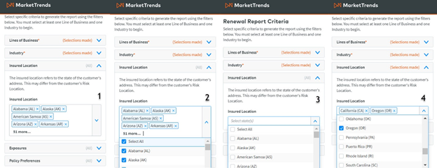 - State of Drivers’ Licenses: This is for commercial auto lines of business. Choose to filter by the state(s) of insured’s drivers’ licenses.