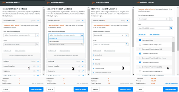 You must select at least one line of business (LOB) and industry to generate the report. All other filters will default to automatically include all selections if no selection is made.