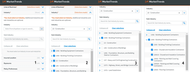 Vertafore MarketTrends uses the NAICS industry hierarchy. You must select at least one 2-digit industry group. Once you have selected an industry group, you must select a minimum one industry from the tree. You can select the entire industry group or any combination of industries within an industry group.