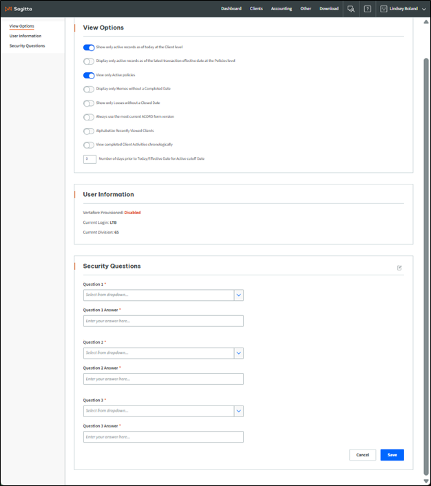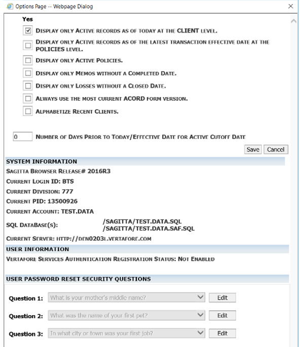 Users who have already set up their security questions are able to edit their questions and answers on the Options page, which can be accessed via Options on the Global navigation bar. Note that the User Password Reset Security Questions edit area will not display if the Allow User Password Reset flag is set to No or null, or if the user has not completed the security questions setup.