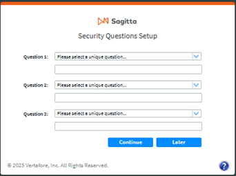 After the System Coordinator enables the User Password Reset feature, each user will be required to set up security questions. Upon logging in, the user will be redirected to the Security Questions Setup page. Select and answer three Security Questions from the drop down lists, and then click Continue. To defer this process, users can click Later in the prompt. The Security Questions Setup page will display upon each login until security questions with valid answers have been saved on the account. After completing the setup, subsequent logins will go directly to the Sagitta Home page, as normal.
