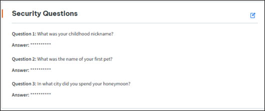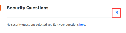 To update security questions, click the Edit button next to the question. Select a new question, or change the answer for an existing question.