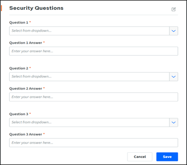 The same validations from the security questions setup process apply; you cannot select the same question more than once, and answers must be a minimum of 3 characters and a maximum of 255 characters.