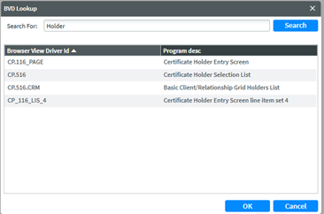 When the BVD Lookup dialog box appears, type all or a portion of the program name or program description in the Search String field, and click "Search" (e.g., "Holders").