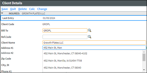 On the Client Details page, valid addresses will be displayed in a drop-down menu after typing two characters in the Address #1 field. Continue typing until the desired address is shown. Select the address to pre-fill the Address #1, City, State, and ZIP Code fields. The Address #2 field does not typically populate from Melissa Data, but that information may be added manually.