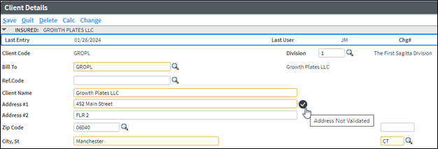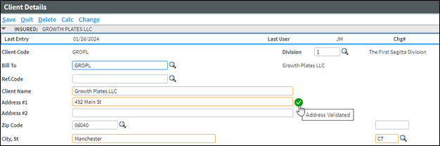 If an Address in the Client Details and Additional Interests page is not previously validated but is a valid address presented in Melissa Data, clicking on the check mark will validate the address by turning it Green.