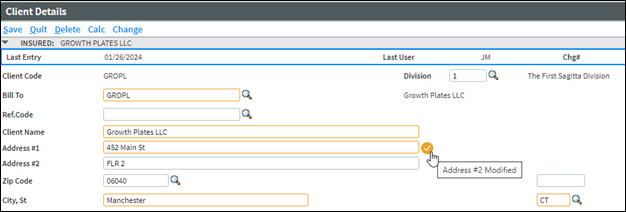 The check mark will turn Yellow when Address #2 is entered. Hover over the check mark to display a tool-tip of Address #2 Modified.