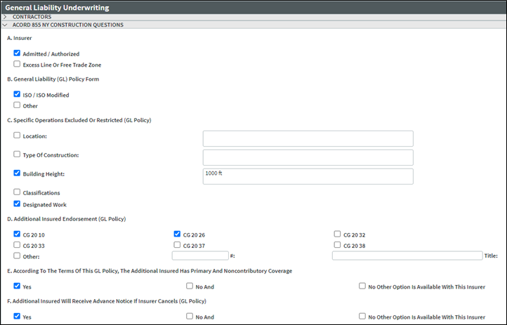 You can now add the ACORD 855 NY Construction Certificate of Liability Insurance Addendum to the ACORD 25 Certificate. To support the 855NY form, fill out the ACORD 855 NY Construction Questions section on the General Liability Underwriting page.